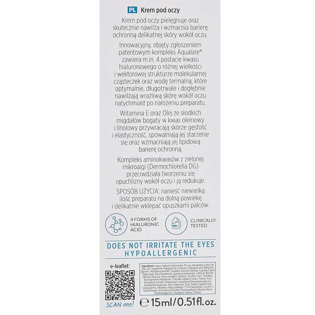 - آبرسانی عمیق و پایدار – این کرم حاوی 4 نوع هیالورونیک اسید با مولکولهای ریز و درشت است که به طور عمیق به لایههای پوست نفوذ کرده و تا 48 ساعت رطوبت مورد نیاز پوست دور چشم را تامین میکند.