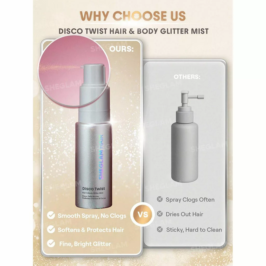 فرمول این اسپری با ویتامین E تقویت شده تا در کنار ایجاد جلوه براق، به حفظ لطافت مو کمک کند. ترکیبات درخشانکننده معدنی، نور را بهخوبی منعکس میکنند و کاپریلیک گلیسریل به نرمی و محافظت از مو و پوست کمک میکند. ذرات بسیار ظریف آن بهصورت یکنواخت پخش میشوند و بدون ایجاد حس چسبندگی یا باقیماندن رد سفید، جلوهای صاف و تمیز ایجاد میکنند.